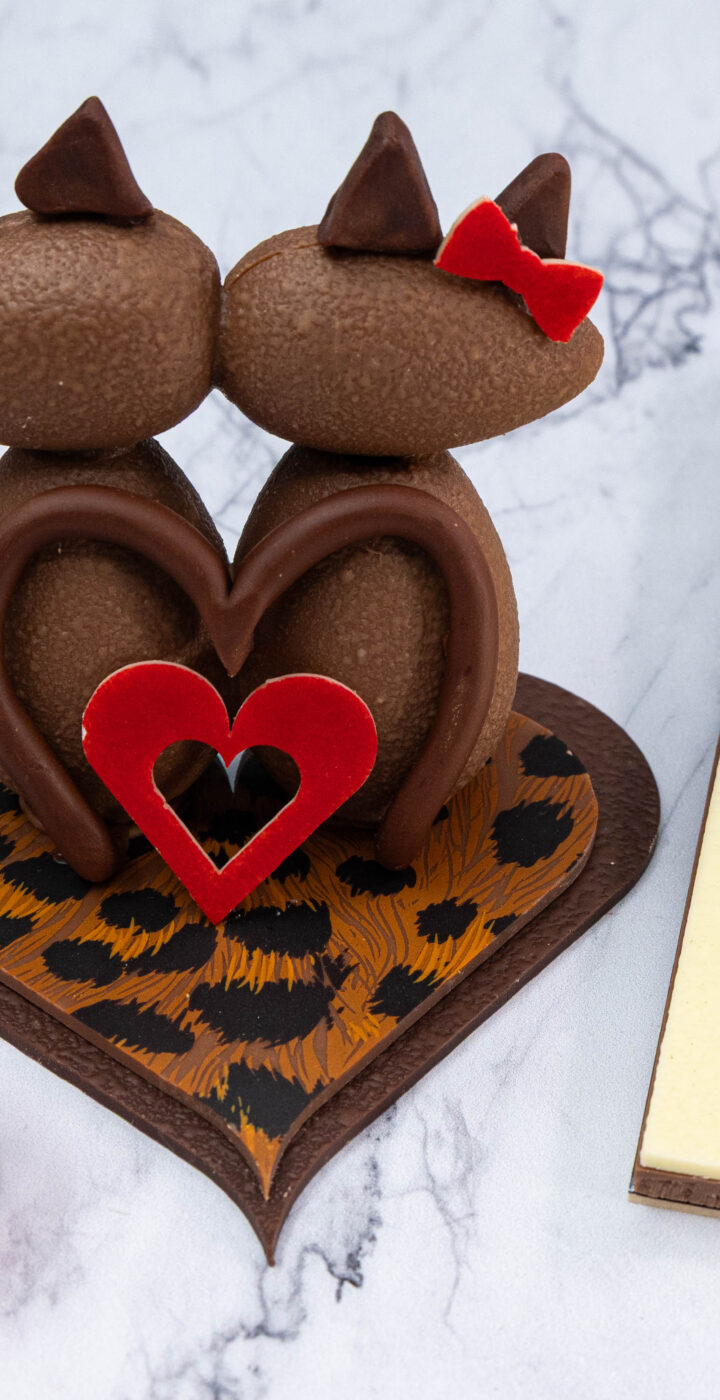 Chocolat au lait avec une fine couche de gianduja à la fève de Tonka à l’intérieur des chats